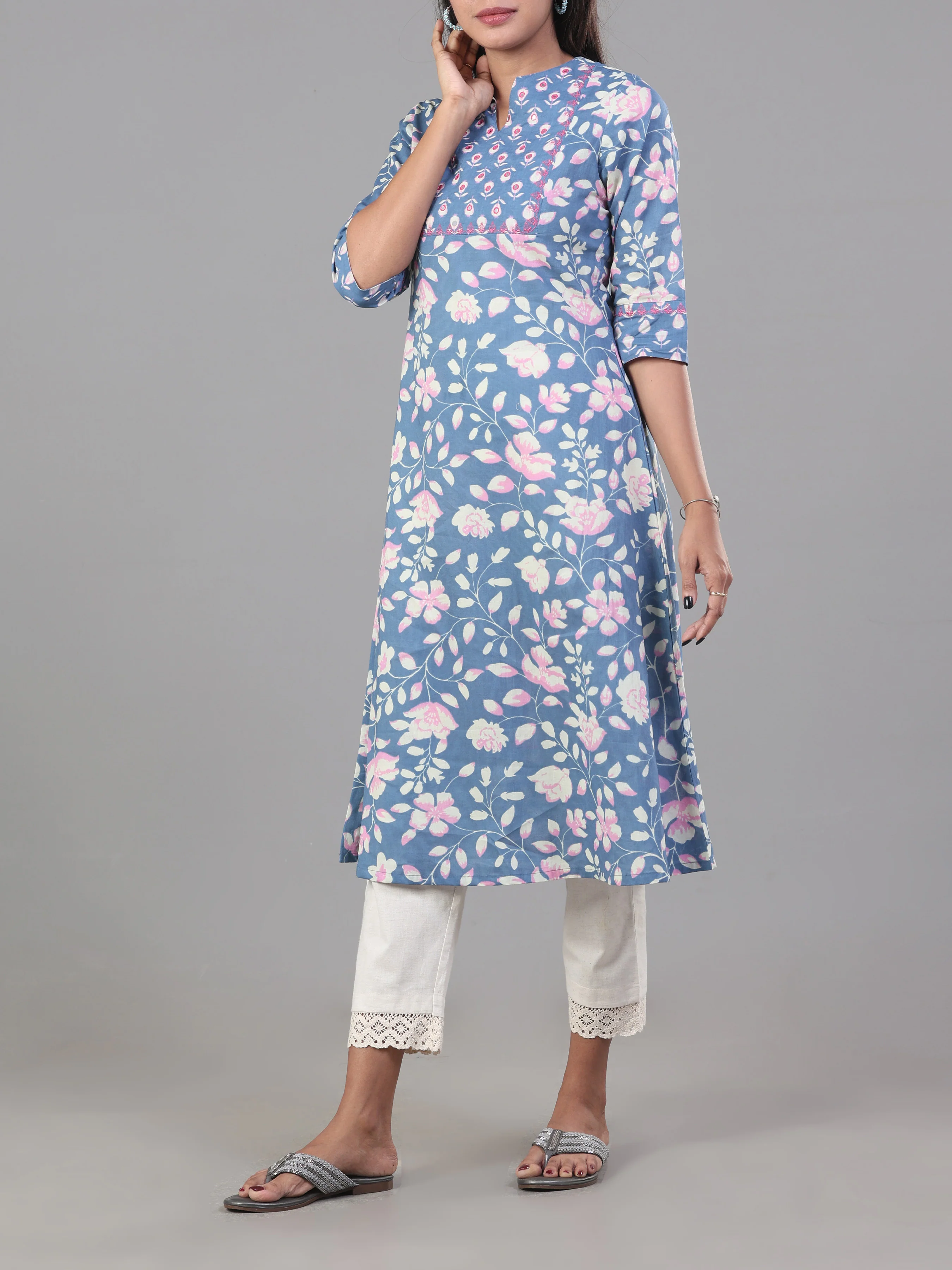 Denim Blue Pure Cotton Printed Kurti With Embroidery