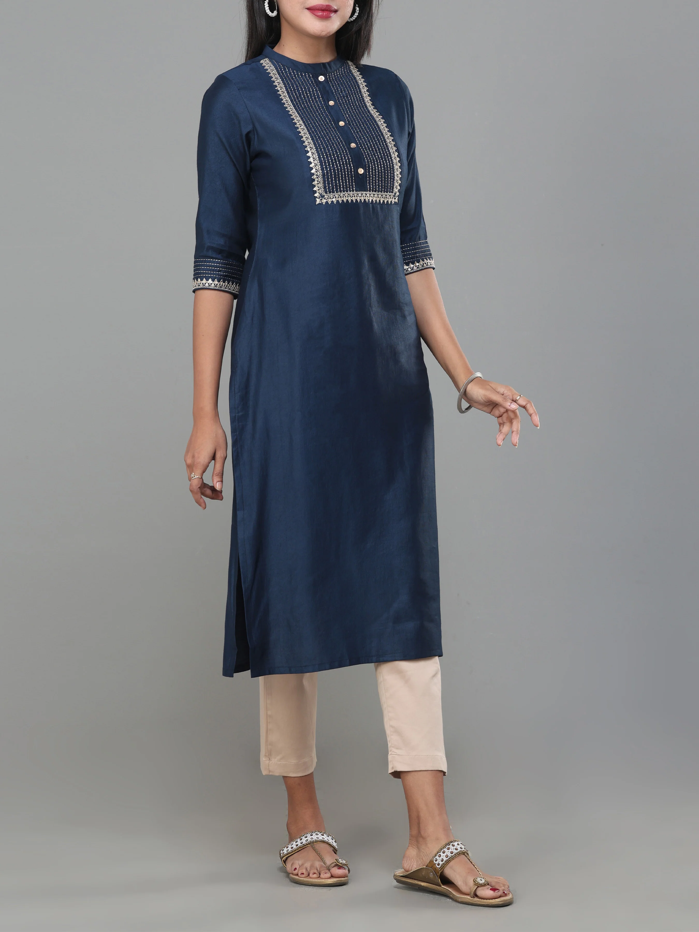 Denim Blue Pure viscose Kurti with Embroidery features a classic denim blue color with subtle prints and delicate embroidery. Made from soft, breathable cotton, it ensures comfort and style. Perfect for casual or semi-formal occasions, this kurti is both simple and elegant.
