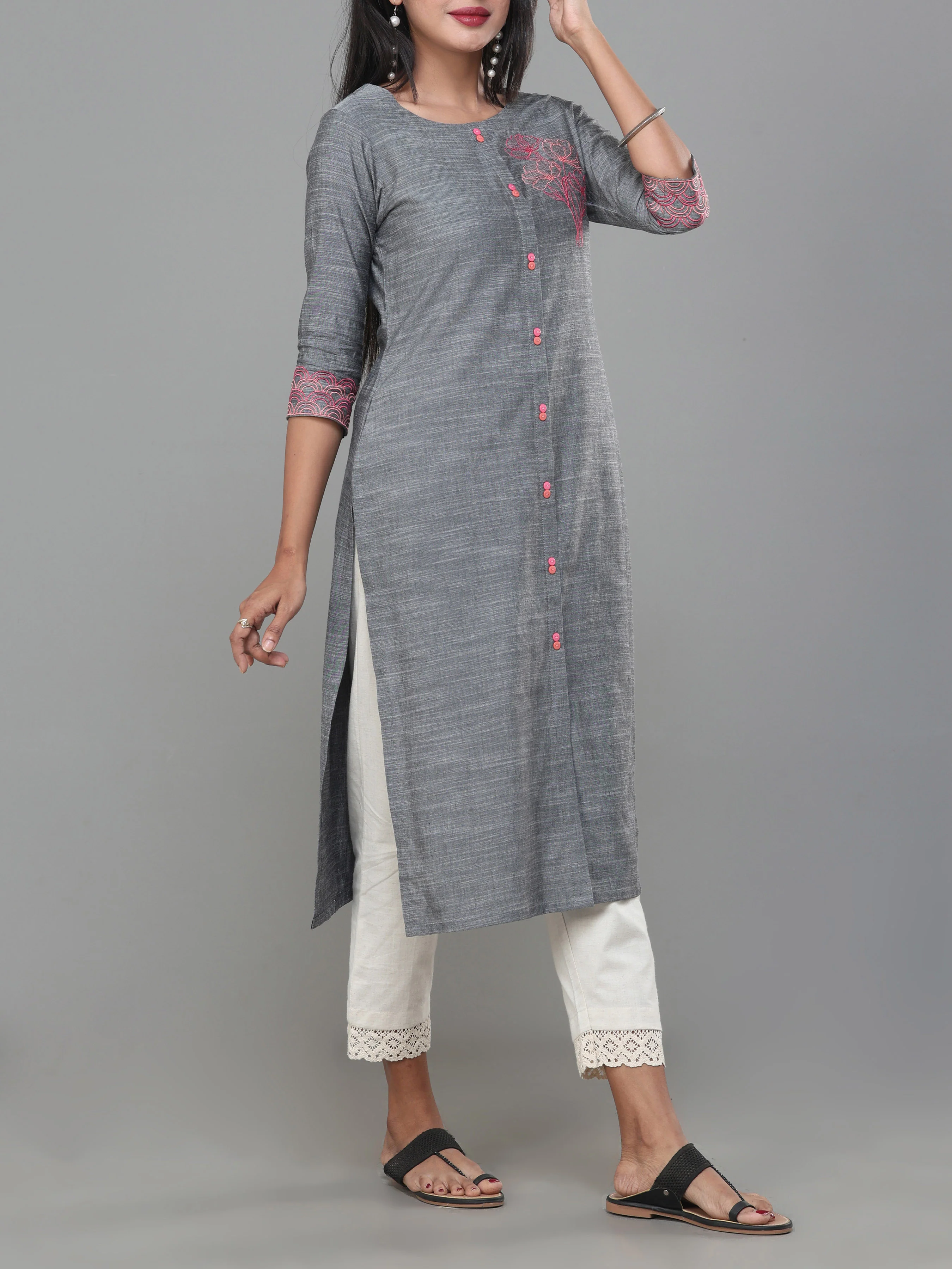 Grey Viscose Cotton Slub Kurti With Embroidery