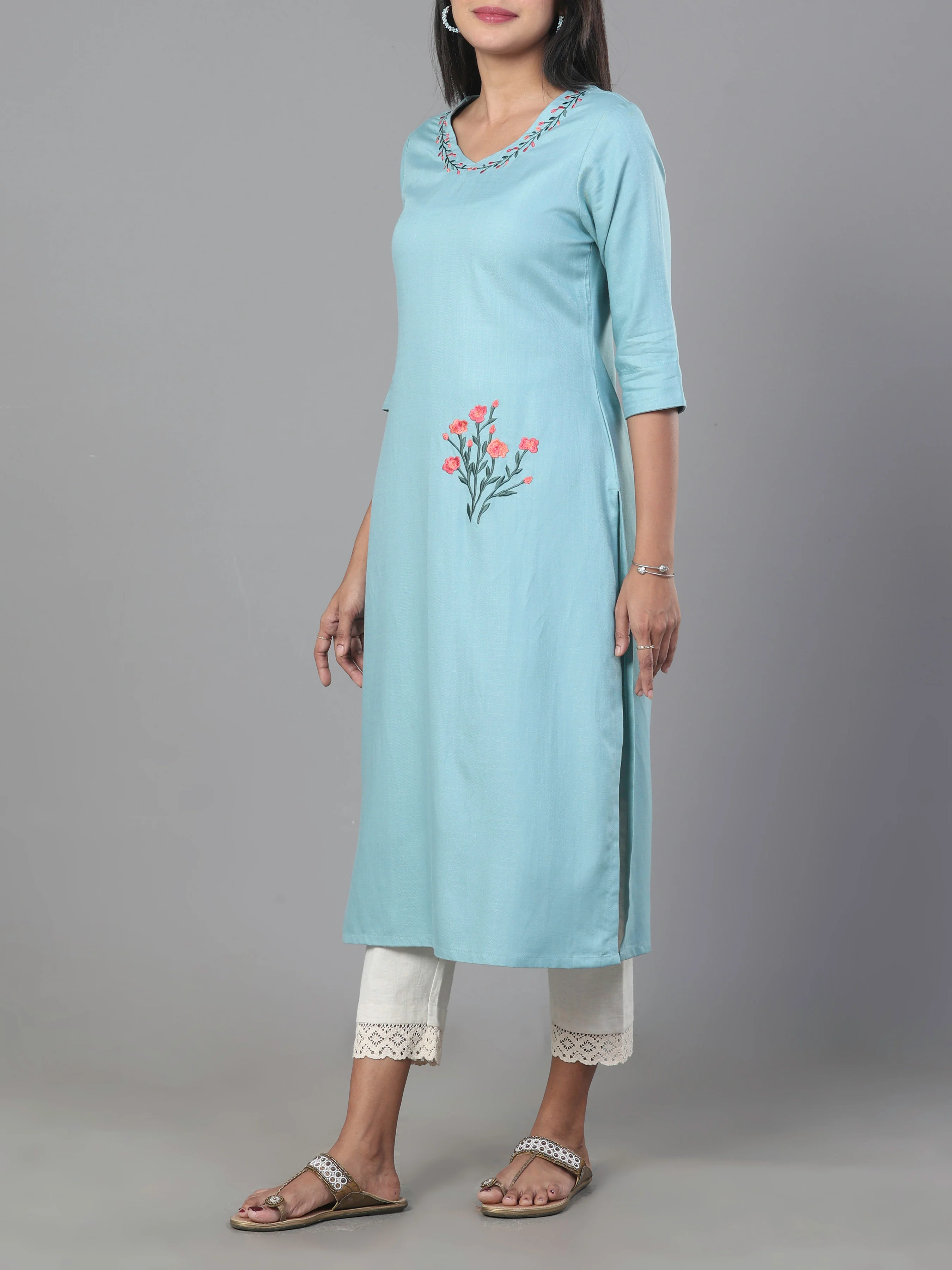 Light Blue Viscose Twill Plain Kurti With Embroidery