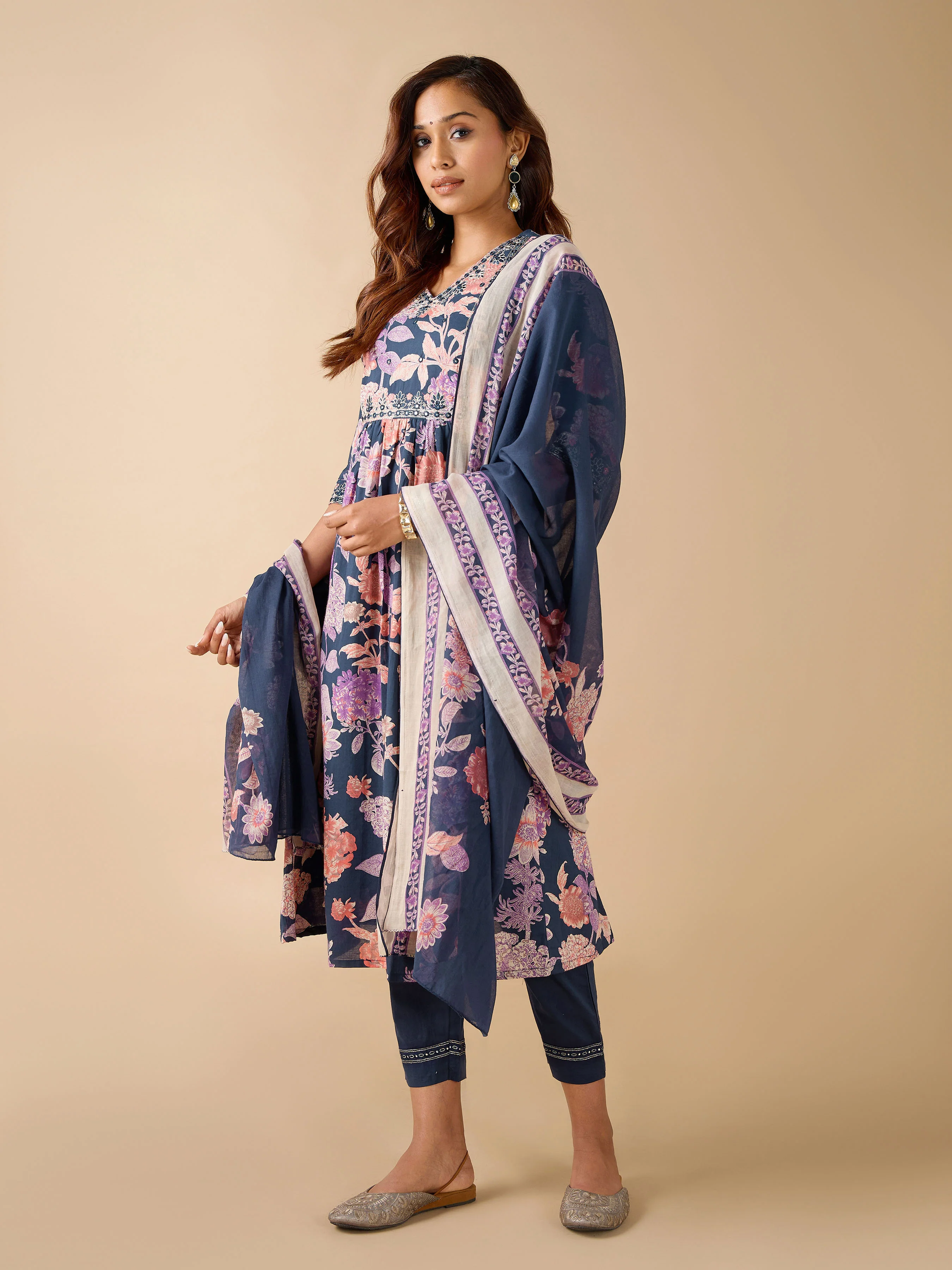 Navy Blue Pure Cotton Floral Printed Kurti Set & Dupatta With Mirror Work