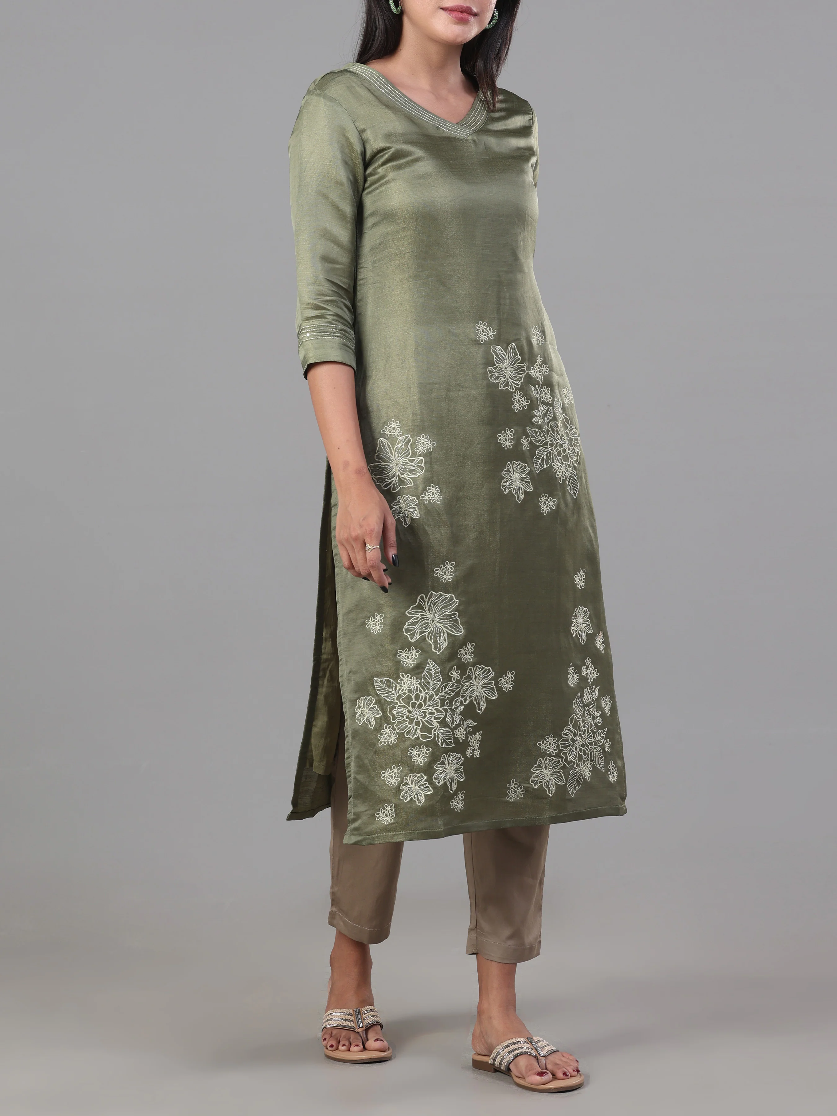 Olive Green Viscose Shimmer Kurti With Embroidery And Matching Bottom