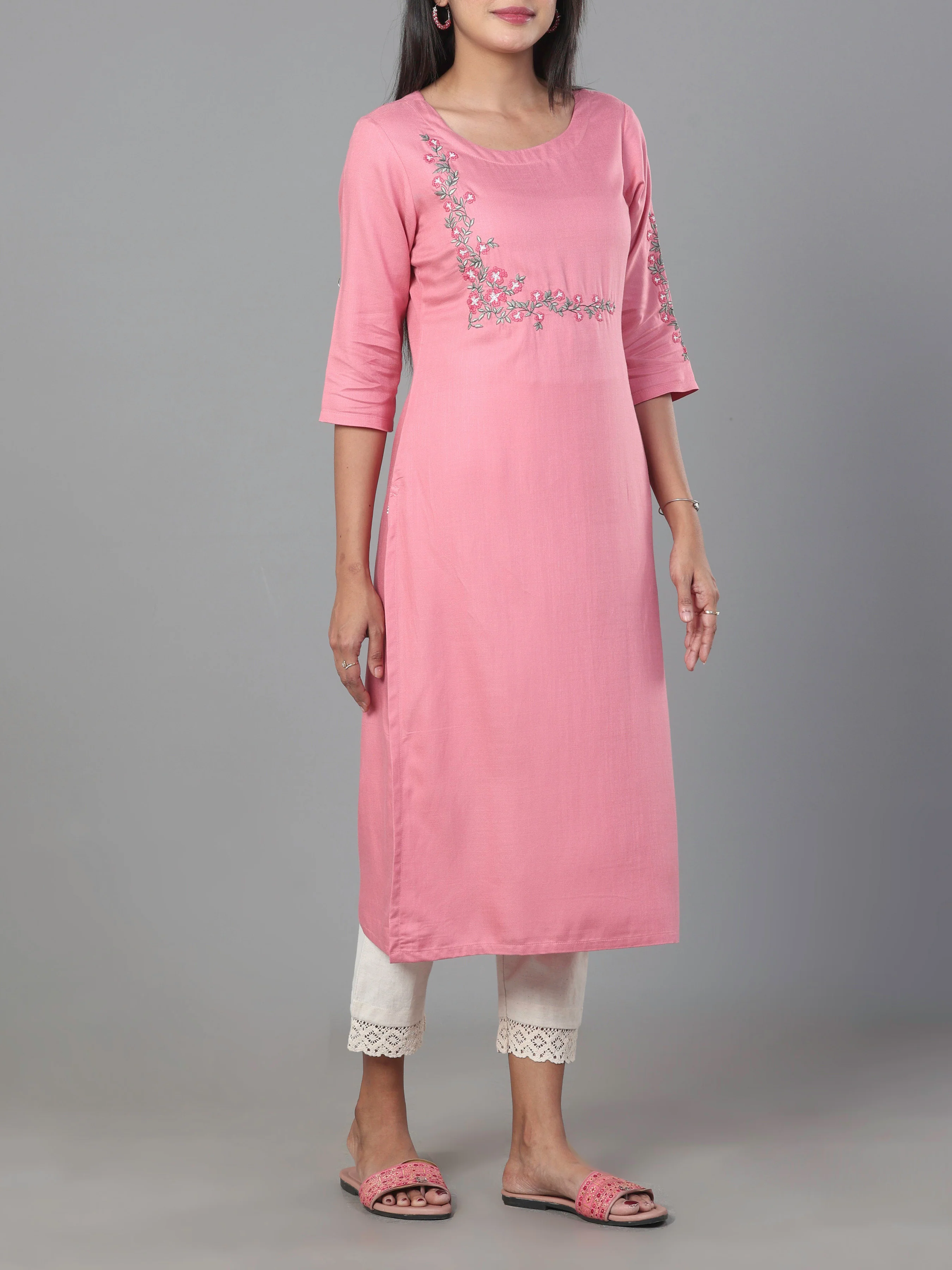 Pink Viscose Twill Plain Kurti With Embroidery