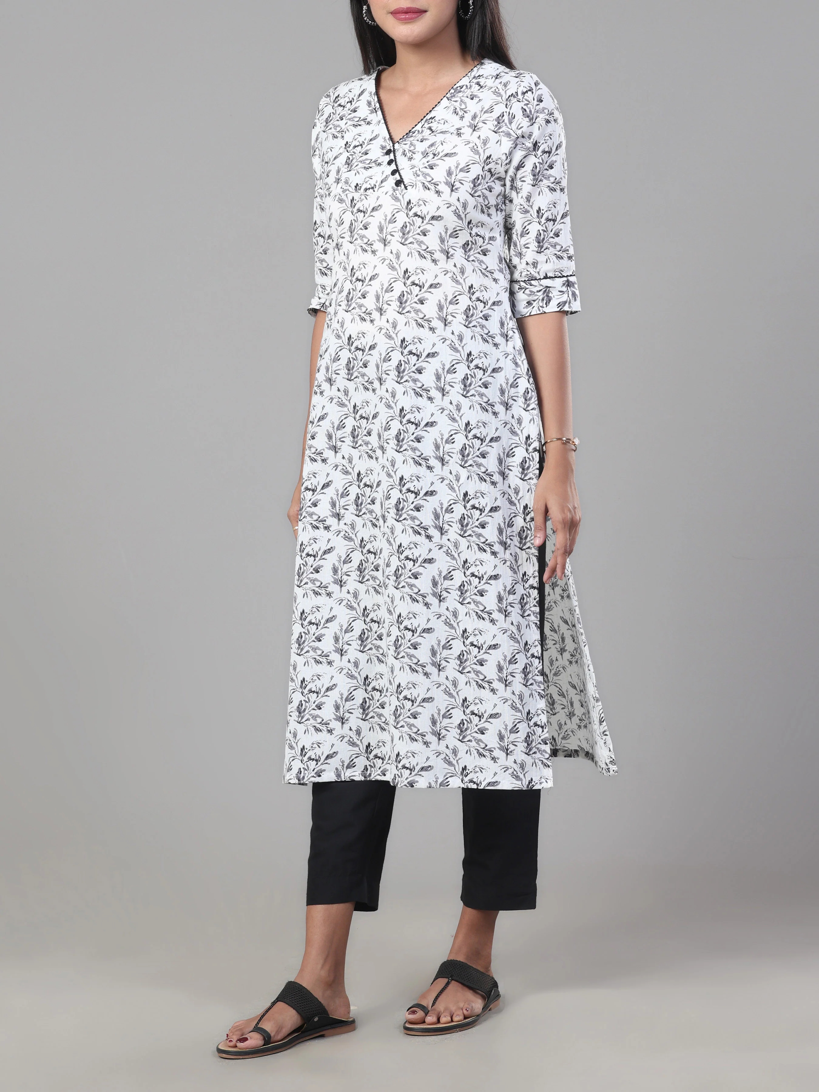 Elevate your style with elegance and grace in this exquisite Kurti from Vismay. Crafted from premium cotton flax, this Kurti not only enhances your fashion quotient but also ensures all-day comfort. The sophisticated V-neckline and 3/4th sleeves add a touch of charm, while the delicate sequin embellishments lend a subtle sparkle. Perfect for any occasion, pair it with leggings and sandals for a timeless, classy look.